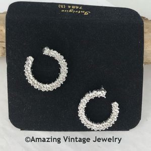 Earrings - Sarah Coventry. "INTRIGUE" from 1976. Silvertone hoops that sit sideways on the ear - the pattern on these are tiny silvertone flowers. Pierced. About 15/16" in diameter. Excellent condition on the original card, no box.