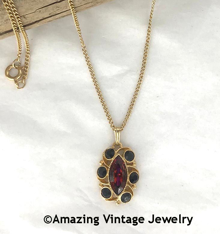 Necklace - Sarah Coventry. "JAVA" from 1974. Goldtone with red/purple marquise-shaped center flanked by black faceted stones - such a unique piece will certainly bring you compliments. Pendant is 1 1/4" long, 11/16" across. Chain is adjustable to 16" and 18" long. Very good condition.