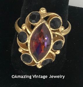 Ring - Sarah Coventry. "JAVA" from 1974. Goldtone with red/purple marquise-shaped center flanked by black faceted stones - such a unique piece will certainly bring you compliments. Adjustable. 15/16" long, 11/16" across. Very good condition.