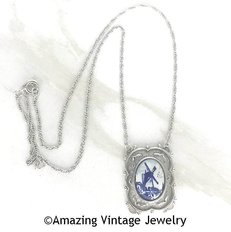 Necklace - Sarah Coventry. "KATRINA" from 1977. Silvertone frame with a genuine Delft inset featuring a blue windmill. Pendant is 1 1/8" long, 7/8" across. Chain is 17 1/2" long. Very good condition.