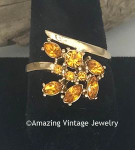 RING - SARAH COVENTRY. "LAURA" HOSTESS RING FROM 1979. GOLDTONE WITH PRETTY, SHINY AMBER RHINESTONES. SIZE 7 - NOT ADJUSTABLE. MARKED sarah IN THE NEWER PRINT FONT. VERY GOOD CONDITION.