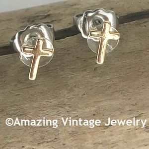 EARRINGS - SARAH COVENTRY. "LITTLE CROSS" PIERCED EARRINGS FROM 1977. THESE ARE TINY! SHINY GOLDTONE CROSS POST EARRINGS. 5/16" LONG, 3/16" ACROSS. SHOWN IN THE CATALOG "FOR LITTLE SARAH AND HER TEENS". VERY GOOD CONDITION.