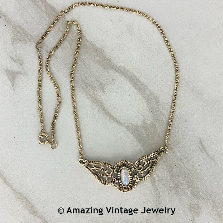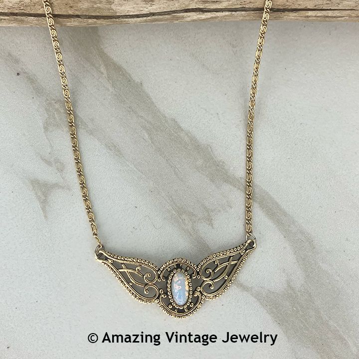 Necklace - Sarah Coventry. "LOVELY LADY" from 1977 - introduced after the ring. Antique-look goldtone with faux opal center will bring back the splendor of the Victorian era. Pendant is about 1/2" long, 1 7/8" across. Adjustable to 14 1/2" to 16 1/2" long. Very good condition.