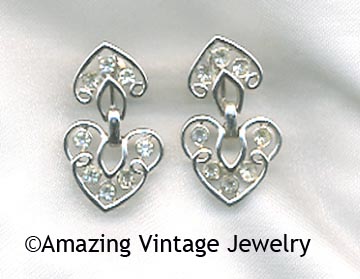 EARRINGS - SARAH COVENTRY. "MONTE CARLO" FROM 1956. BRIGHT, SHINY SILVERTONE CUT-OUT DESIGN, ACCENTED WITH CLEAR, SPARKLING RHINESTONES. SCREWBACK EARRINGS ARE 1 1/2" LONG, 7/8" ACROSS. VERY GOOD VINTAGE CONDITION. NOT MARKED, BUT SHOWN IN THE SARAH COVENTRY INSPIRATIONS PAGES. INSPIRATIONS PAGE NOT INCLUDED.