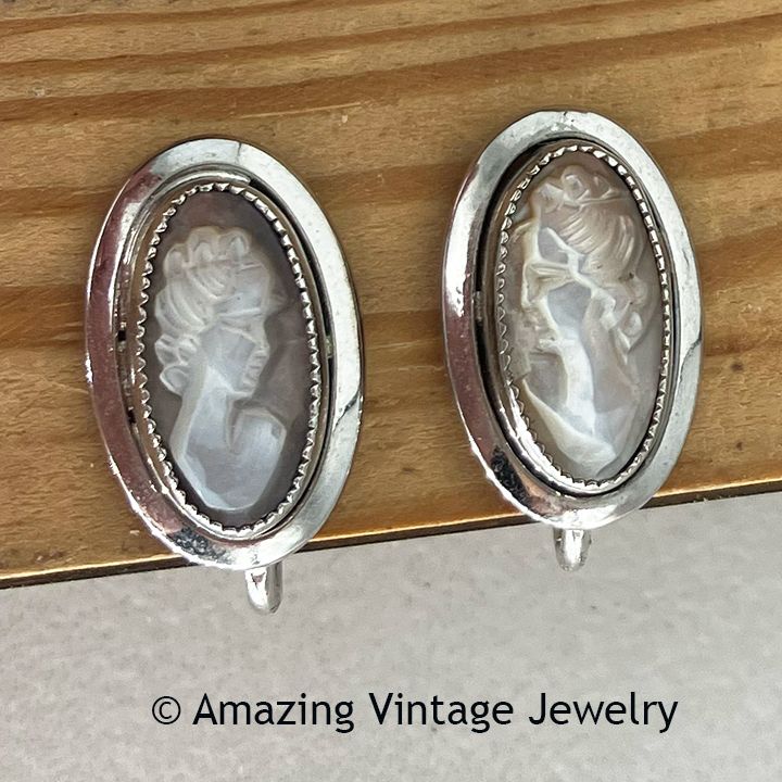 Earrings - Sarah Coventry. "MOTHER OF PEARL CAMEO" from the Lady Coventry line of 1969. Tiny sterling silver frames with mother of pearl look cameo insets - an artistic combination of tradition and style. Screwbacks. 11/16" long, 7/16" across. Very good condition. No card or box.
