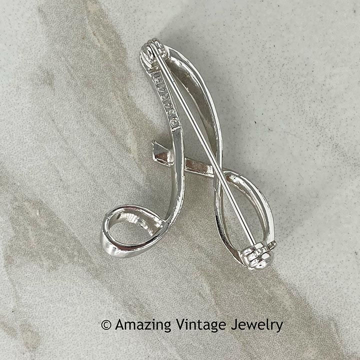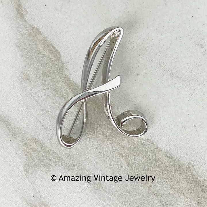 Pin - Sarah Coventry. "MULTIPLE CHOICE PINS" from the April 1978 catalog. Bright silvertone "A". 1 3/8" long, 1 3/16" across. Very good condition. There is a small dark spot on the left upper edge but is very hard to see.