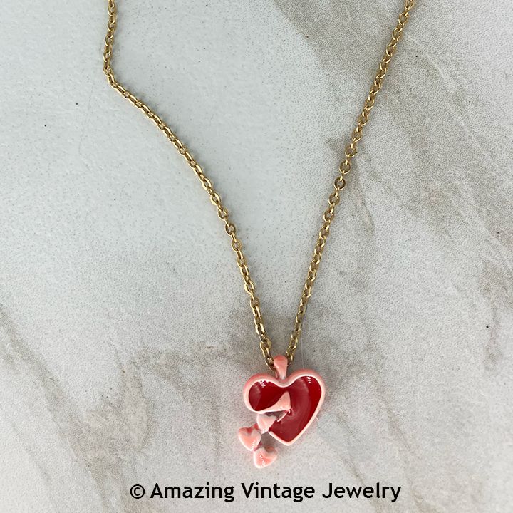 Necklace - Sarah Coventry. "ONE AND ONLY" from 1984. Red and pink enamel hearts on a goldtone chain. Pendant is 11/16" long, 1/2" across. Chain is 16" long - not adjustable. Very good condition. Rare item!