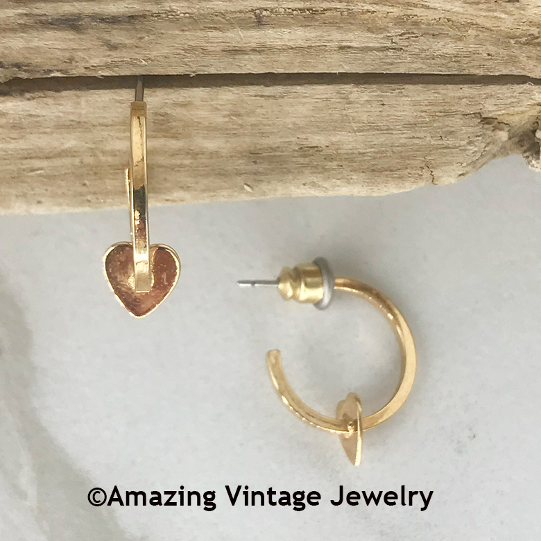 Earrings - Sarah Coventry. "PIERCED HEART" from 1978. Small, narrow goldtone hoops with tiny goldtone heart. Pierced. 9/16" in diameter. Very good condition.