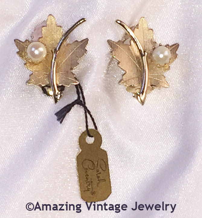 EARRINGS - SARAH COVENTRY. "PRECIOUS" WITH CULTURED PEARLS - FROM 1964. SATIN-FINISHED GOLDTONE LEAVES WITH CULTURED PEARL ACCENTS. CLIP. 1 1/16" LONG, 7/8" ACROSS. EXCELLENT CONDITION - ON THE ORIGINAL CARD, NO BOX.