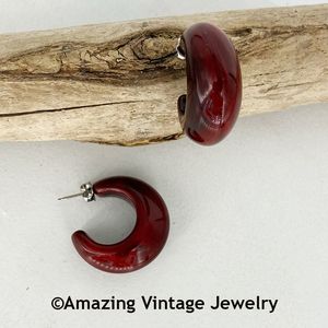 Earrings - Sarah Coventry. "SAFARI" from 1978 . Dark red/black marbled half hoops. Pierced. About 1 1/16" in diameter. Very good condition. Wing backs are marked SARAH and are the originals.