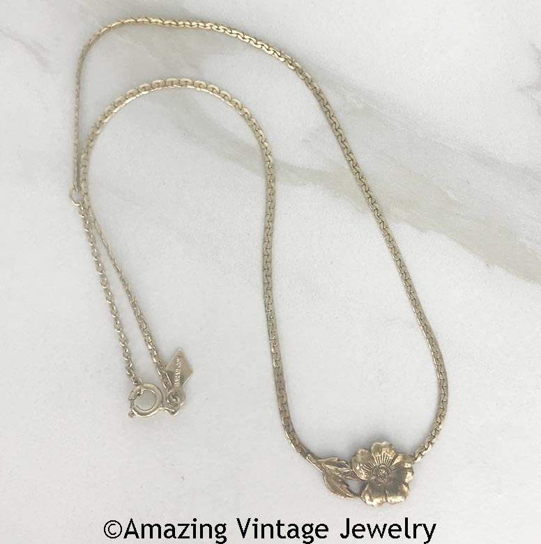 Necklace - Sarah Coventry. "SPRING POSIE" from 1980. Antique gold look small goldtone flower is 3/4" across, 1/2" wide. Adjustable to 15" and 17" long. Very good condition.