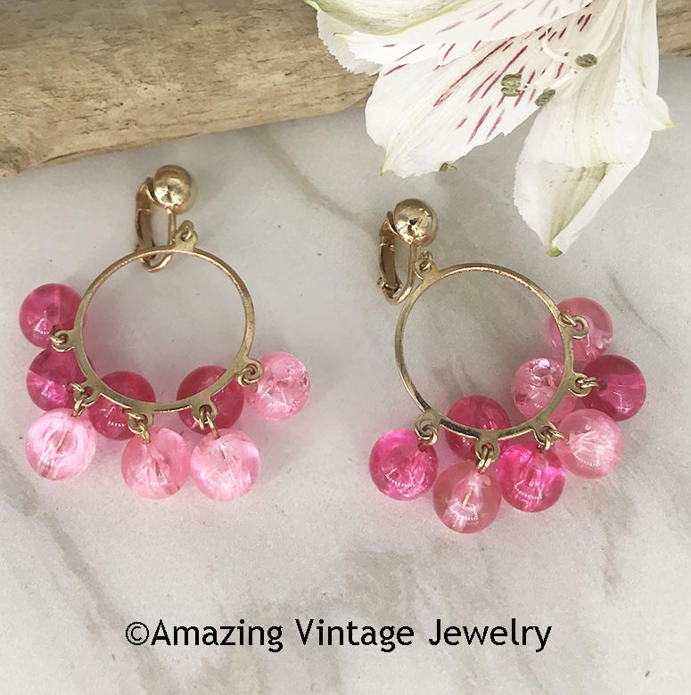 EARRINGS - SARAH COVENTRY. "SURFIN'" FROM 1966. FUN CRACKED-LOOK LUCITE BALLS IN LIGHT PINK AND HOT PINK ATTACHED TO GOLDTONE HOOPS THAT MOVE WHEN YOU MOVE. LIGHTWEIGHT. CLIP. 2 1/4" LONG. GOLDTONE HOOP IS 1" IN DIAMETER. VERY GOOD CONDITION.