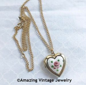 NECKLACE - SARAH COVENTRY. "TEEN HEART LOCKET" FROM 1974. LARGE GOLDTONE LOCKET WITH PRETTY CLOISONNE LOOK ROSE INSET. LOCKET DOES OPEN FOR YOU TO PUT A PHOTO INSIDE. LOCKET PENDANT IS 1 1/8" LONG, 1" ACROSS. CHAIN IS ADJUSTABLE TO 16" AND 18" LONG. EXCELLENT CONDITION IN THE ORIGINAL BOX ON THE ORIGINAL CARD, ALTHOUGH THERE IS SOME DETERIORATION BEGINNING AROUND THE OUTER EDGES OF THE CLOISONNE INSET (TYPICAL WITH THESE TYPE OF PIECES)...SEE THE PHOTO - THIS IS THE EXACT PIECE YOU WILL RECEIVE.
