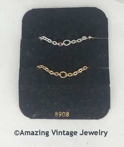 ACCESSORY - SARAH COVENTRY. "THE EXTENDER CHAINS" FOR NECKLACES - ONE GOLDTONE, ONE SILVERTONE. ATTACH TO ANY NECKLACE TO GIVE A LONGER LENGTH. FASTENS AT AN EXTRA 1 1/2" OR USE THE WHOLE LENGTH TO ADD 3 1/4" TO YOUR NECKLACE. VERY GOOD CONDITION - ON THE ORIGINAL CARD - THE SPRING CLASP ON THE GOLD ONE IS SLIGHTLY DISCOLORED AND STICKS A BIT. THIS PARTICULAR SET (SC #8908) WAS SOLD IN THE JANUARY 1977 CATALOG, AND WAS REPLACED BY THE SC#8599 STYLE, CALLED ONLY "EXTENDER CHAINS" WHICH WERE 3/4" LONGER THAN THESE.