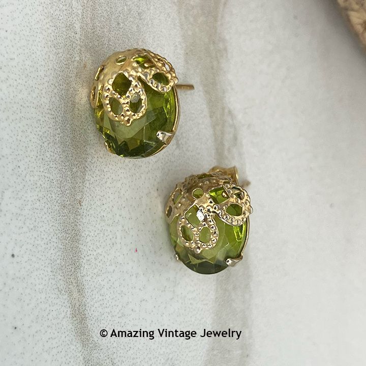 Earrings - Sarah Coventry. "TOUCH OF ELEGANCE" from 1971 - introduced shortly after the pin, necklace and clip earrings. Small olive green faceted stones, set in delicate goldtone filigree. Pierced. About 9/16" long, 5/16" wide - small - make sure you understand the size. Very good condition. Not marked. Wingbacks may or may not be the originals.